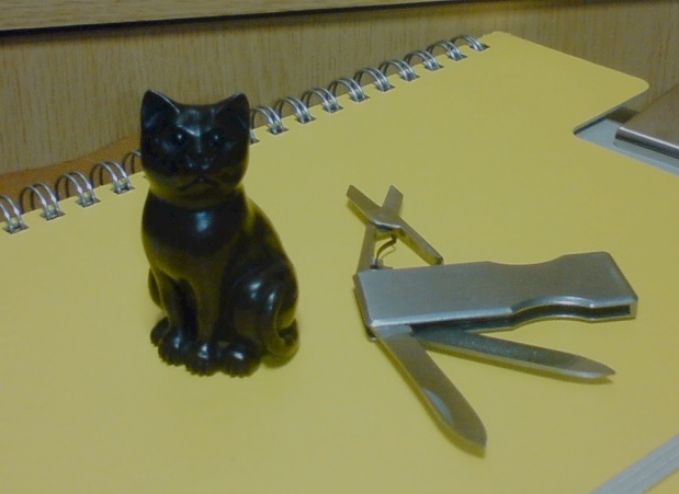 猫の根付けとナイフ。