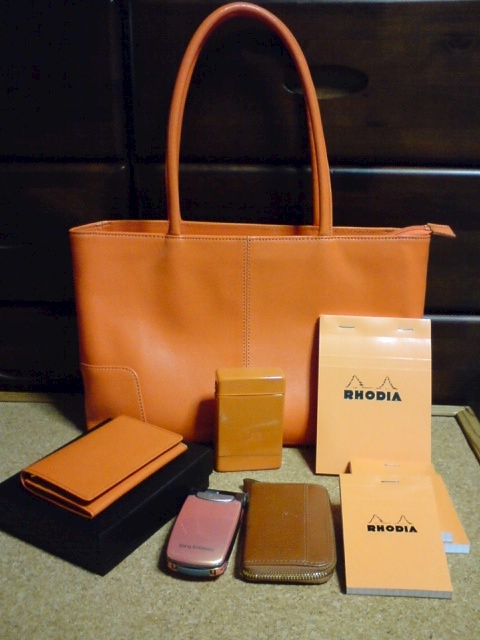 小さめのトートバッグ、未使用。だってさー、ずっと雨が降ってんだもん。箱の上は、小銭入れ付き定期入れ。真ん中は、友人がくれたタバコの缶ボックス。いや、ライターが入らないんだよね(笑)昔のケータイと味の出て来た小銭入れ。右はオレンジの定番、ロディアのメモパッド、No.11とNo.13。
