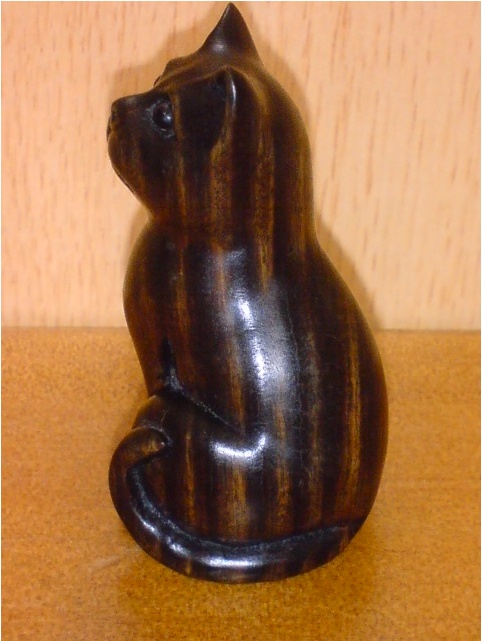 ちょっと前の日記に、この猫の裏にひもを通す穴があると書いたが、根付けはそれが正解らしい。煙草入れのひもに付けた根付けを下から通して、帯の上から根付けが顔を出すのだ。つまり、ストラップとかキーホルダーとかとは逆の使い方をするわけだ。なるほど。ナゾは解けたけど、この木の種類が一体何なのか、聞いたけど忘れた。柿みたいな縞だが、見る人が見ればわかるんだろうな、きっと。