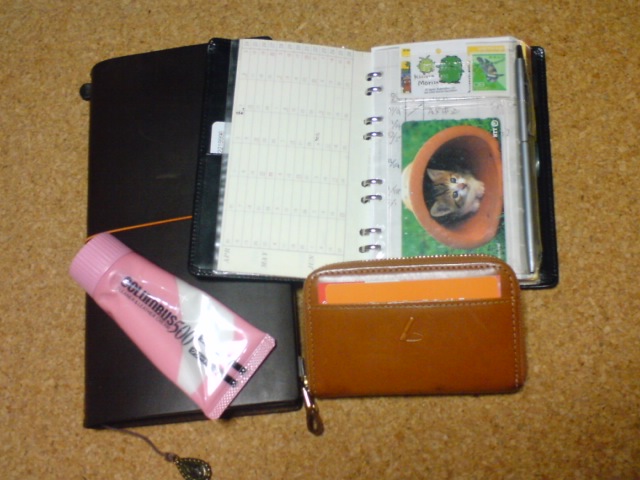 ピンクの革用クリーナーと左の巨大な手帳はトラベラーズノート。革の変化が一番よく判る。今度パスポートサイズが出るそうだ。ふーん。右上の黒いのはいつも持ち歩いているSD(システムダイアリー)の手帳。2000年に手に入れてから、オレが毎日手にしているのがこれ。無くなったらチョー困るなあ。