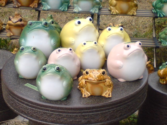 お店のかえるさんたち。 真ん中のピンクと黄色のかえるがオレの家にいるサイズ。大中小の中です。こちらを睨んでいるりあるたいぷかえるさんのとなりに、緑のかえるがいます。この大きさで、口に入り口があって底に黒い丸いゴムがついていたのが、オレが割ってしまった貯金箱です(引っ越し屋のにーちゃんが落としたんだけど)。