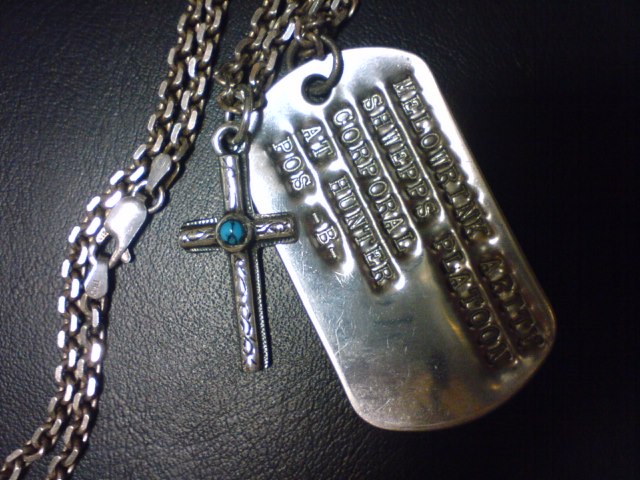 メロウリンク・アリティのドッグタグはもちろんそこら辺に売っているわけがない。イベント会場に手動刻印機を持ち込んでスペースを取っている人がいたのだ。お好みの文字や名前をすぐ作ってくれるのだが、これは机の上に並んでいた出来合いのヤツ。