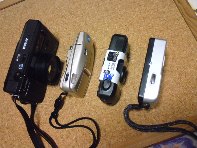 カメラの重さの比較級。手前から、ビビター、写ルンです、オリンパス、キャノンオートボーイ。どれも35mmだけど、オリンパスのみAPSで規格が違う。さっき、バカ○○○カメラと言ったけど、ウチの母上は一コマのフィルムに36枚全風景を収めるという暴挙を成し遂げた事がある。要するにスプロケットにフィルムの穴がきちんとはまってなかったらしい。自動巻き上げのカメラとはいえ、スプールに引っかかってなければ意味がない。APSはいいよね、フィルムを入れるだけだから(笑)今となってはかなり重いけど。