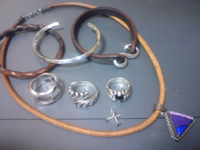 家に帰って、着替える前に外すもの。眼鏡以外。ブレス3本は左腕。穴空きチーズのようなものは左手親指、または中指。真ん中は右手中指。ブラックスター(スターダイオプサイト)は右手の小指用。ペンダントはALZUNIで、石の種類を訊いてみたけど、作家さんが不在で判らなかった。