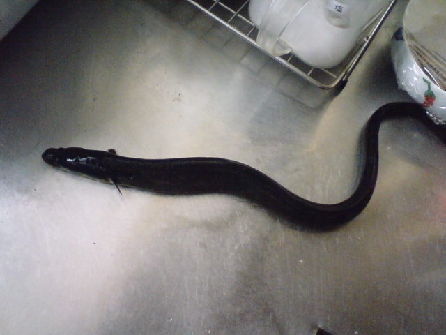 昨日、母上と父上が釣って来たうなぎ。海にいるのにあなごではなく、うなぎなのだそうだ。河口が近いからね。その後、こんがりと蒲焼きにされ美味しくいただかれた。ムスメは食わない。